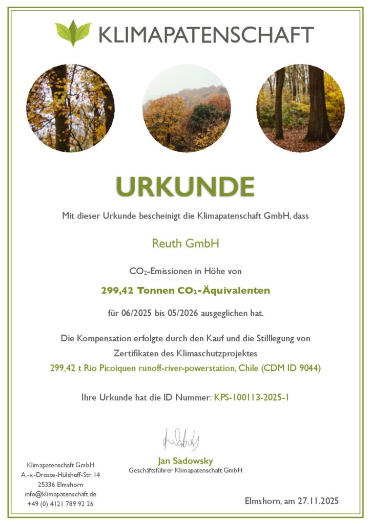 Despite all our efforts, Reuth GmbH still generates CO2 emissions. To offset this, we purchase CO2 certificates from the “Baum Invest AG” forestry project (gold standard climate protection project). That is why we are proud to have been climate-neutral since this year.
